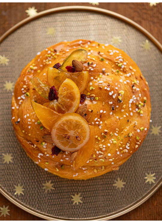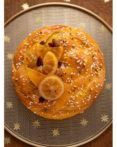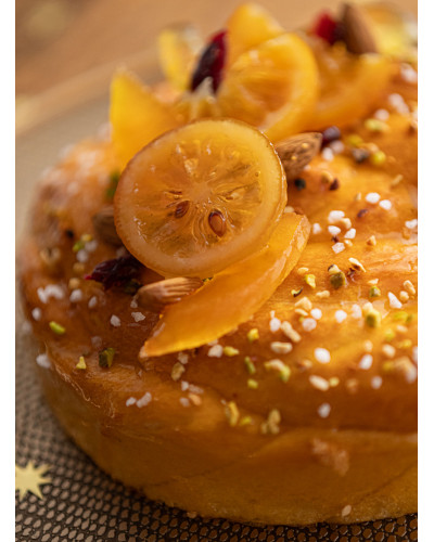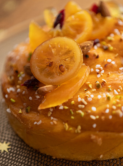 Brioche Vendéenne ultra moelleuse parfumée au pastis, à la fleur d'oranger et au rhum, nappage abricot, pistaches, amandes et noisettes hachées, sucre cassons, fruits confits de Provence.