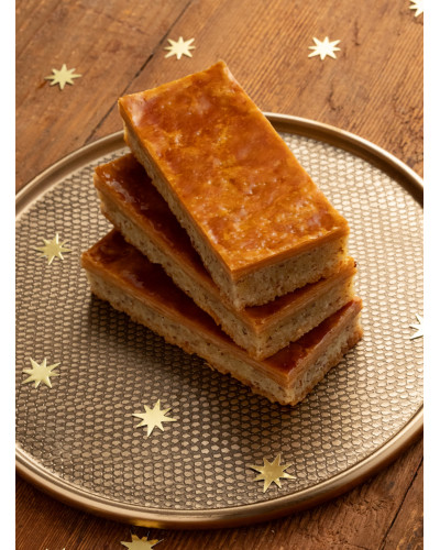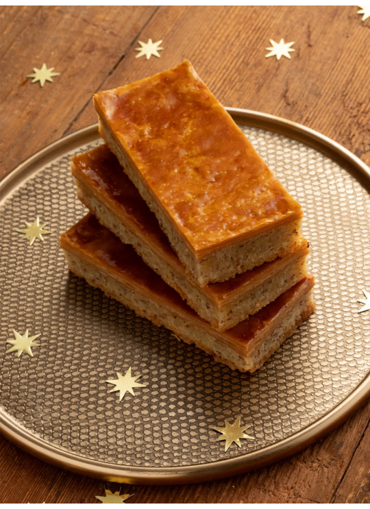 Pâte feuilletée caramélisée, crème amandine fondante aux amandes de Provence, crumble croustillant.