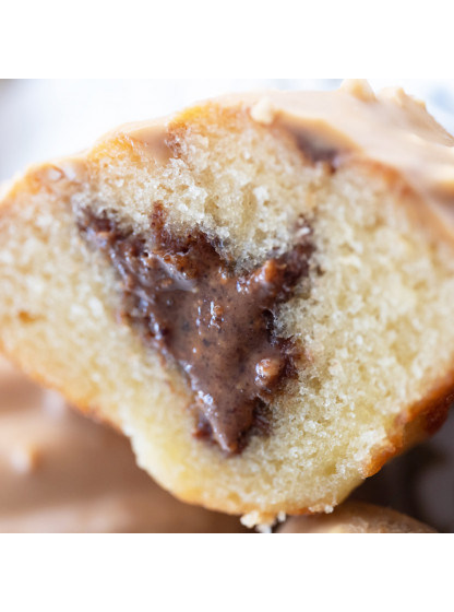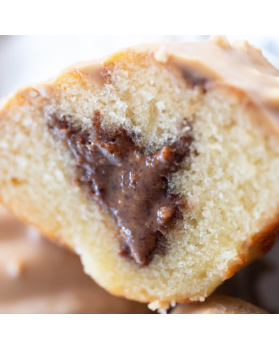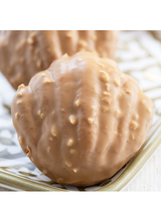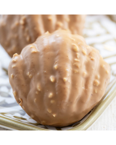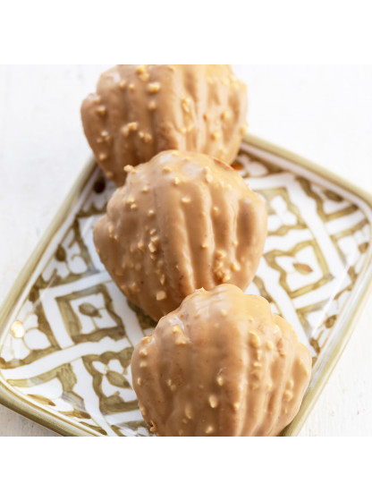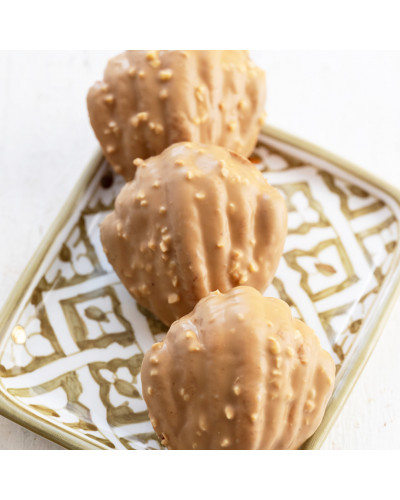Madeleine nature garnie d'un praliné noix de pécan, enrobée d'un glaçage dulcey amande.