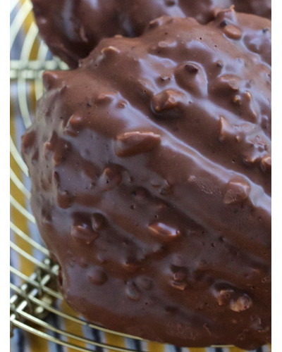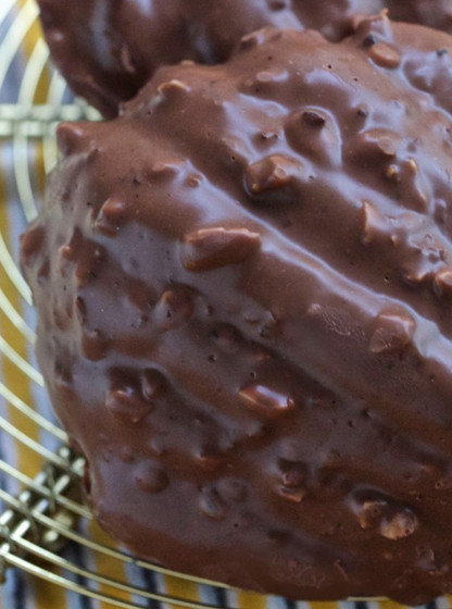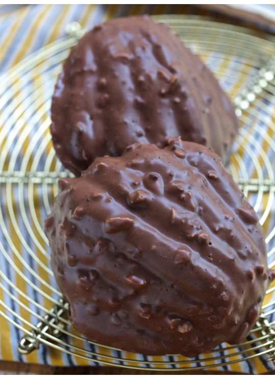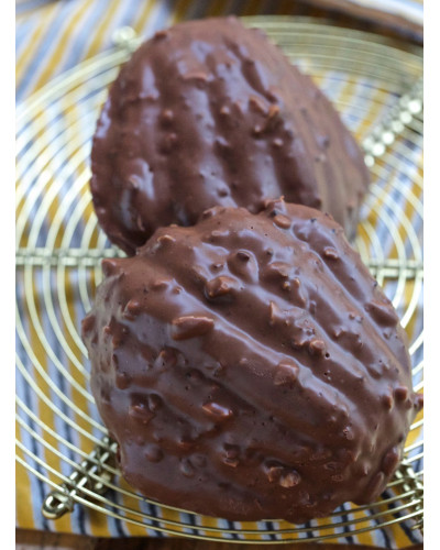 Madeleine nature garnie d'une ganache au gianduja et enrobée d'un glaçage façon rocher noisette.