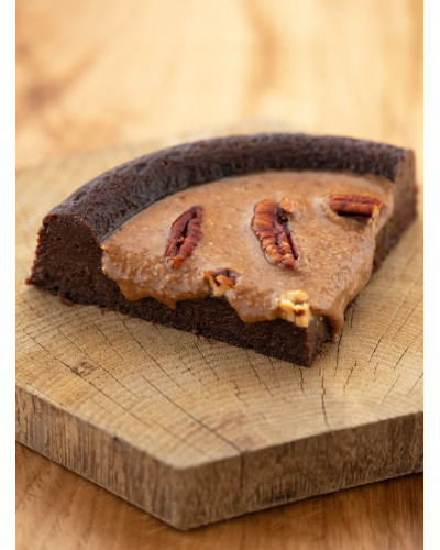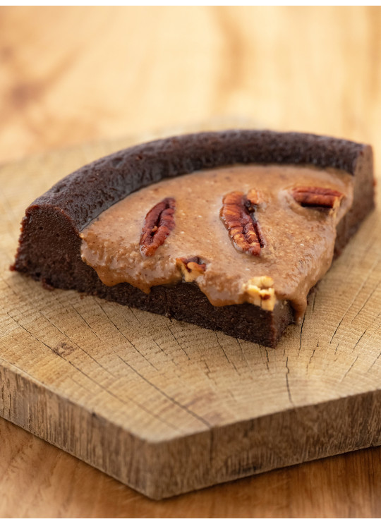 Fondant chocolat 66%, praliné noix de pécan, noix de pécan caramélisées.