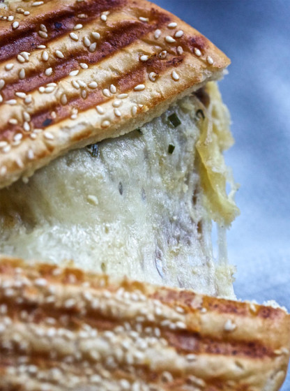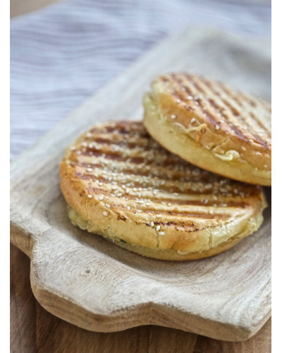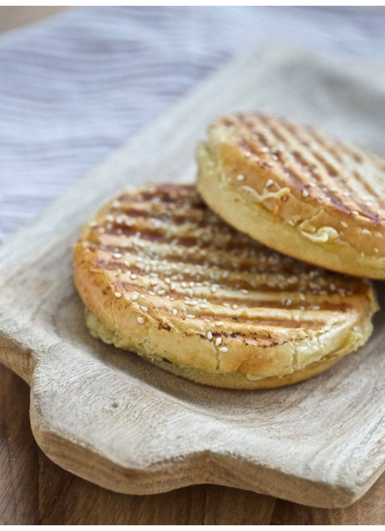 Pain Brioché, crème fraîche moutarde ciboulette, compotée d'oignons, comté AOP, emmental, sésame.