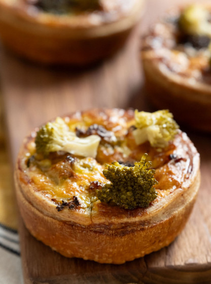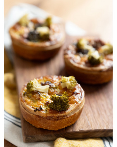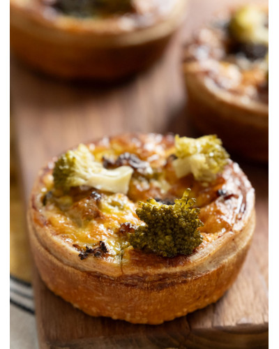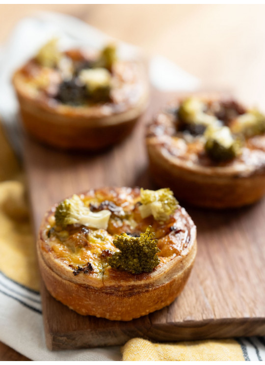 Pâte à foncer, appareil à quiche légèrement relevé au curry, brocolis en pickles et persil plat.
