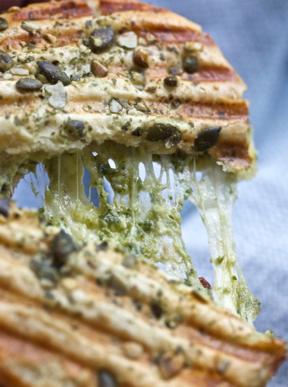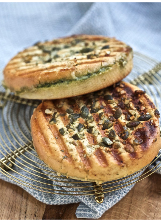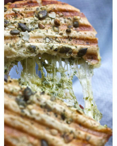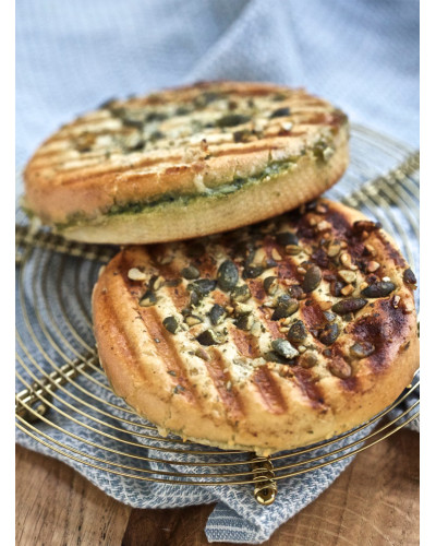 Pain brioché, base crème fraîche, pesto basilic, tomates séchées, mozzarella et emmental, graines de courge.