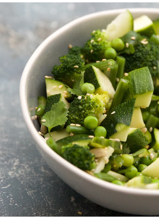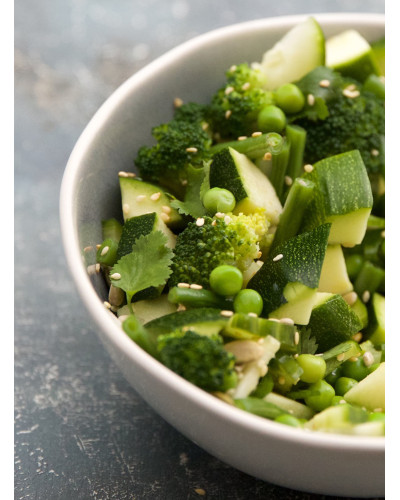brocoli, haricots verts, petit pois, courgette, concombre, eau, huile d'olive de Kalamata, graines de courge, graine de SESAME blanc, graines de tournesol, tahine (crème de SESAME), coriandre, jus de yuzu, MOUTARDE de Dijon (contient de la MOUTARDE et des SULFITES), vinaigre balsamique (contient des SULFITES), amidon de maïs, sel.